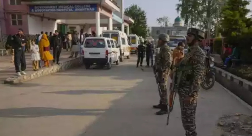 Indian security officers stand guard at a hospital in Jammu and Kashmir’s Anantnag district after assailants fired at tourists in the tourist destination of Pahalgam on Tuesday